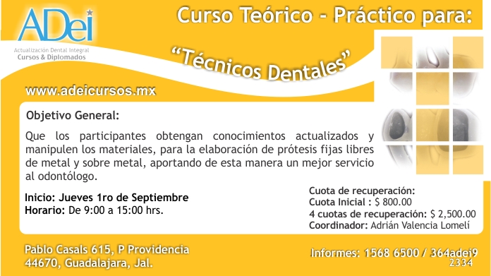 | Cerámica libre de metal (Estratificado): Rescate y ajuste, Preparación de las cofias, Montaje de cerámica en cofias, Textura, Glaseado, Pulido. | Teórico |
